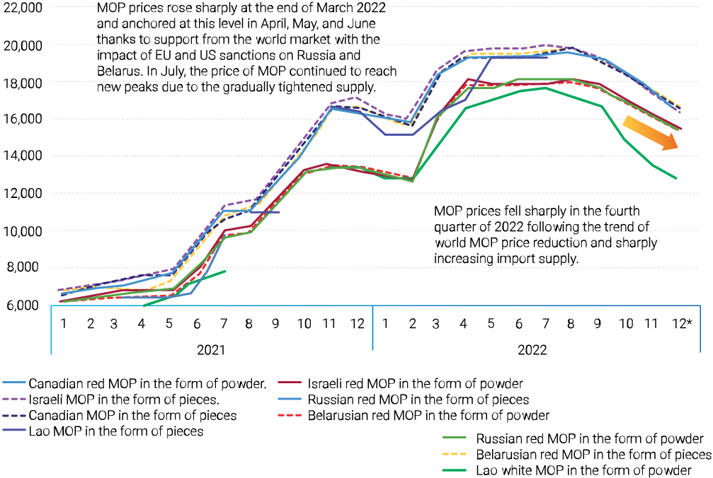 MOP supply in Vietnam depends on imports, so in 2023 it will continue to be affected by world supply and prices. ICI experts forecast that in 2023 the world supply of MOP may not be guaranteed because the sanctions against Belarus and Russia are still in place etc. Therefore, the MOP price may remain high. However, after consumption demand in Vietnam and the world both fell sharply in 2022, the market expects demand to recover in 2023 although it is difficult to return to 2021’s levels. AgroMonitor forecasts MOP consumption in Vietnam in 2023 will increase 24-35% compared to that of 2022 to 230,000-250,000 tons, but still reduced by 110,000-130,000 tons compared to 2021’s figures. Import volume is also forecasted to increase to 800,000-900,000 tons, an increase of 250,000-350,000 tons compared to 2022’s import volume but there will still be a decrease of 300,000-400,000 tons compared to 2021’s figures.