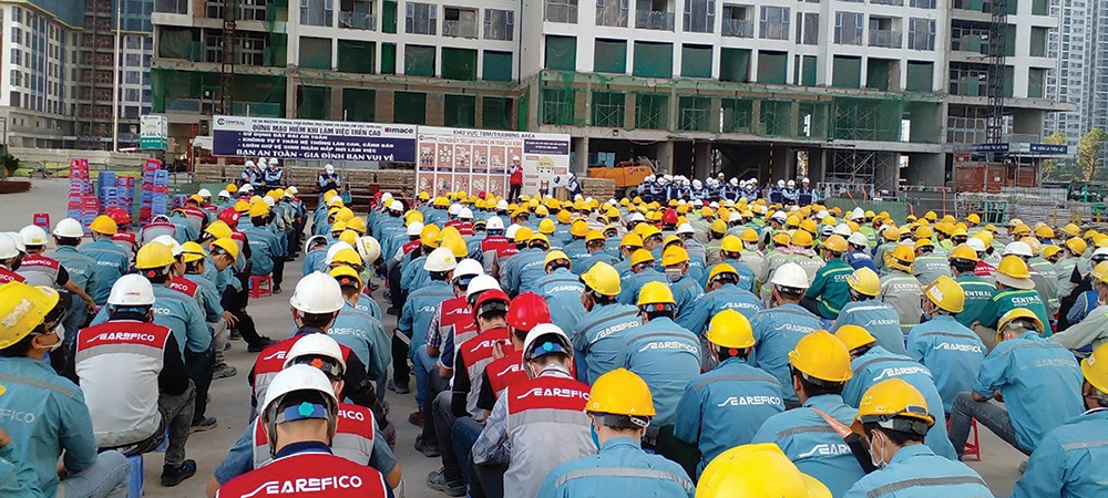 Khi cao điểm, Searefico E&C có thể huy động hàng trăm, hàng nghìn công nhân tham gia thực hiện dự án để đảm bảo tiến độ. Hình ảnh trên trong một buổi phổ biến Quy tắc an toàn công trường.