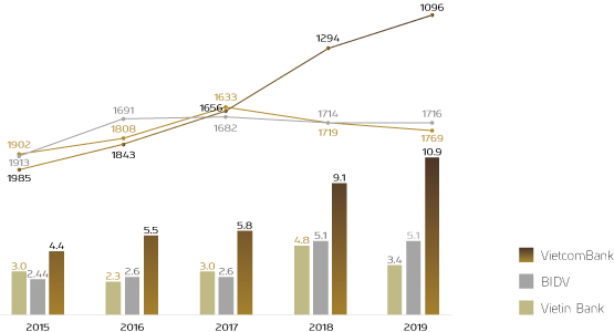 Trong Bảng xếp hạng “The World’s Largest Public Companies 2019” của Forbes, Vietcombank ở vị trí dẫn đầu trong số các công ty Việt Nam và đứng thứ 1.096, tăng tới 198 bậc so với năm 2018. Với giá trị thị trường đạt ngưỡng 10,9 tỷ USD, chỉ trong vòng 5 năm, giá trị thị trường của Vietcombank đã gia tăng gần 3 lần so với thời điểm 2015, năm bắt đầu bước vào giai đoạn tái cơ cấu 2016 - 2020.