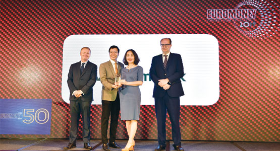 Đại diện Vietcombank, ông Phạm Anh Tuấn – Ủy viên HĐQT (đứng giữa) nhận giải thưởng của Tạp chí Asiamoney.
