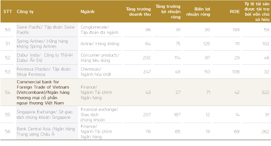 Nikkei đồng thời cũng công bố Top 100 doanh nghiệp quyền lực nhất trong bảng xếp hạng này và có xếp thứ hạng. Ba doanh nghiệp Việt Nam lọt Top 100 là Vinamilk - đứng vị trí thứ 25, Vietcombank - đứng thứ 54 và PetroVietnam, xếp thứ 84.