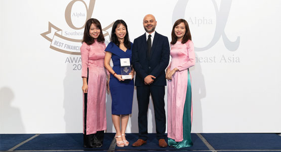 Đại diện Vietcombank, bà Vũ Thị Bích Thu - Trưởng VPĐD tại Singapore (thứ 2 từ trái sang) nhận giải thưởng “Ngân hàng tốt nhất Việt Nam” của Tạp chí Alpha SEA.