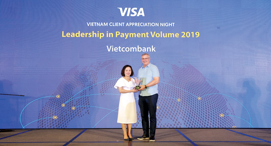 Tháng 11/2019, tại Phú Quốc, trong khuôn khổ Hội nghị khách hàng thường niên năm 2019 của Tổ chức thẻ quốc tế Visa, Vietcombank được vinh danh tại 6 hạng mục giải thưởng quan trọng, bao gồm: Ngân hàng dẫn đầu về doanh số chi tiêu thẻ (Leadership in Payment Volume 2019); Ngân hàng dẫn đầu về doanh số chi tiêu thẻ ghi nợ (Leadership in Debit Payment Volume 2019); Ngân hàng dẫn đầu về doanh số thanh toán thẻ (Leadership in Merchants Sales Volume 2019); Ngân hàng dẫn đầu về doanh số chi tiêu thẻ ở nước ngoài (Leadership in Cross-Border Payment Volume 2019); Ngân hàng dẫn đầu về tỷ lệ kích hoạt thiết bị thanh toán thẻ không tiếp xúc (Leadership in Contactless active terminals penetration 2019); Ngân hàng đầu tiên ra mắt thiết kế thẻ theo công nghệ Visa QuickRead (First Bank to launch Visa QuickRead 2019).