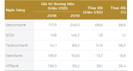 Tháng 7/2019, Tạp chí Forbes Việt Nam đã công bố danh sách Top 50 thương hiệu dẫn đầu. Vietcombank là ngân hàng duy nhất nằm trong Top 10 thương hiệu dẫn đầu, giá trị thương hiệu đạt 246,5 triệu USD, tiếp tục dẫn đầu các ngân hàng trên thị trường với khoảng cách 98,5 triệu USD so với ngân hàng đứng thứ 2 và 105,4 triệu USD so với ngân hàng thứ 3. Đây là năm thứ 3 liên tiếp Vietcombank giữ vị trí là thương hiệu ngân hàng có giá trị nhất trong danh sách bình chọn của Forbes Việt Nam.